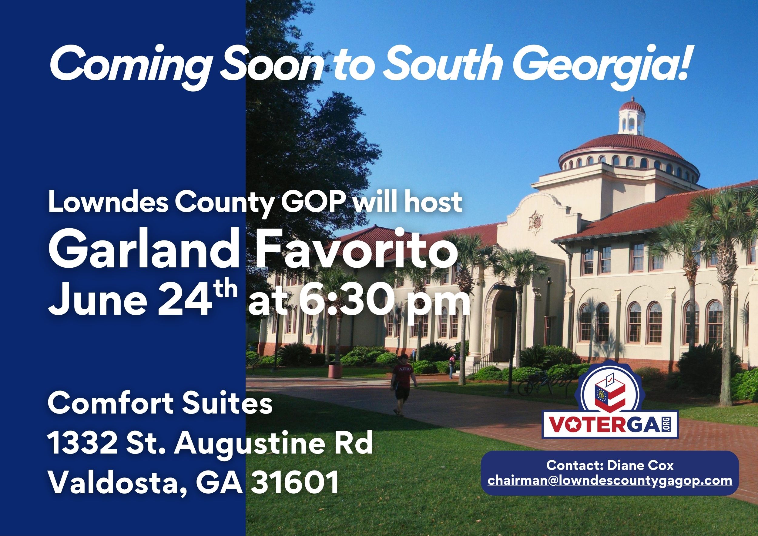 - Spread the word! Lowndes County GOP will host Garland Favorito on June 24th at 6:30 p.m. at the Comfort Suites, 1332 St. Augustine Rd., Valdosta, GA 31601. Click here for flyer.