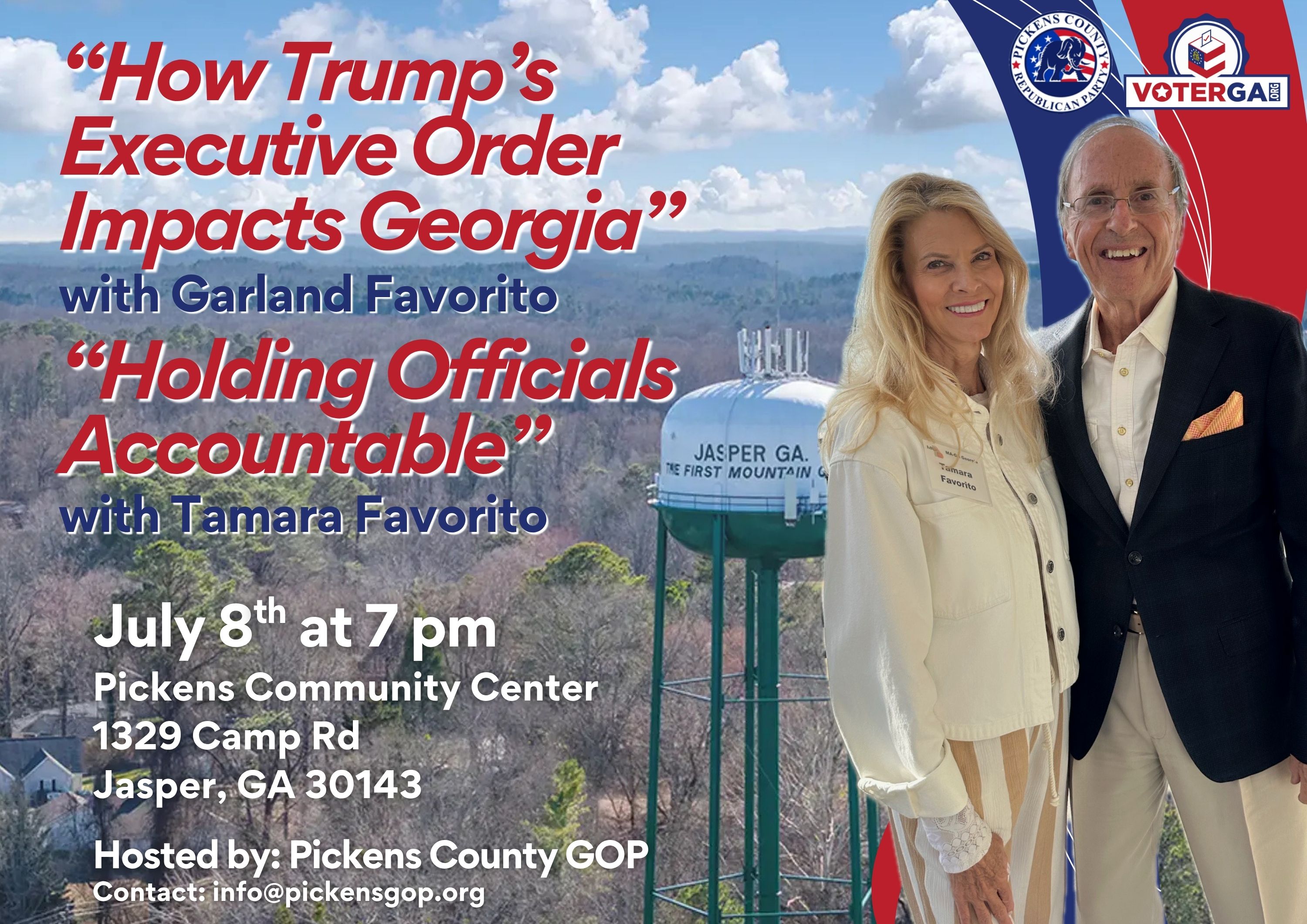 - The Pickens GOP will host Garland and Tamara Favorito presenting “How Trump’s Executive Order Impacts Georgia and Achieving Accountability” on July 8th at 7 p.m. at the Pickens Community Center, 1329 Camp Rd, Jasper, Georgia 30143. Click here for flyer.