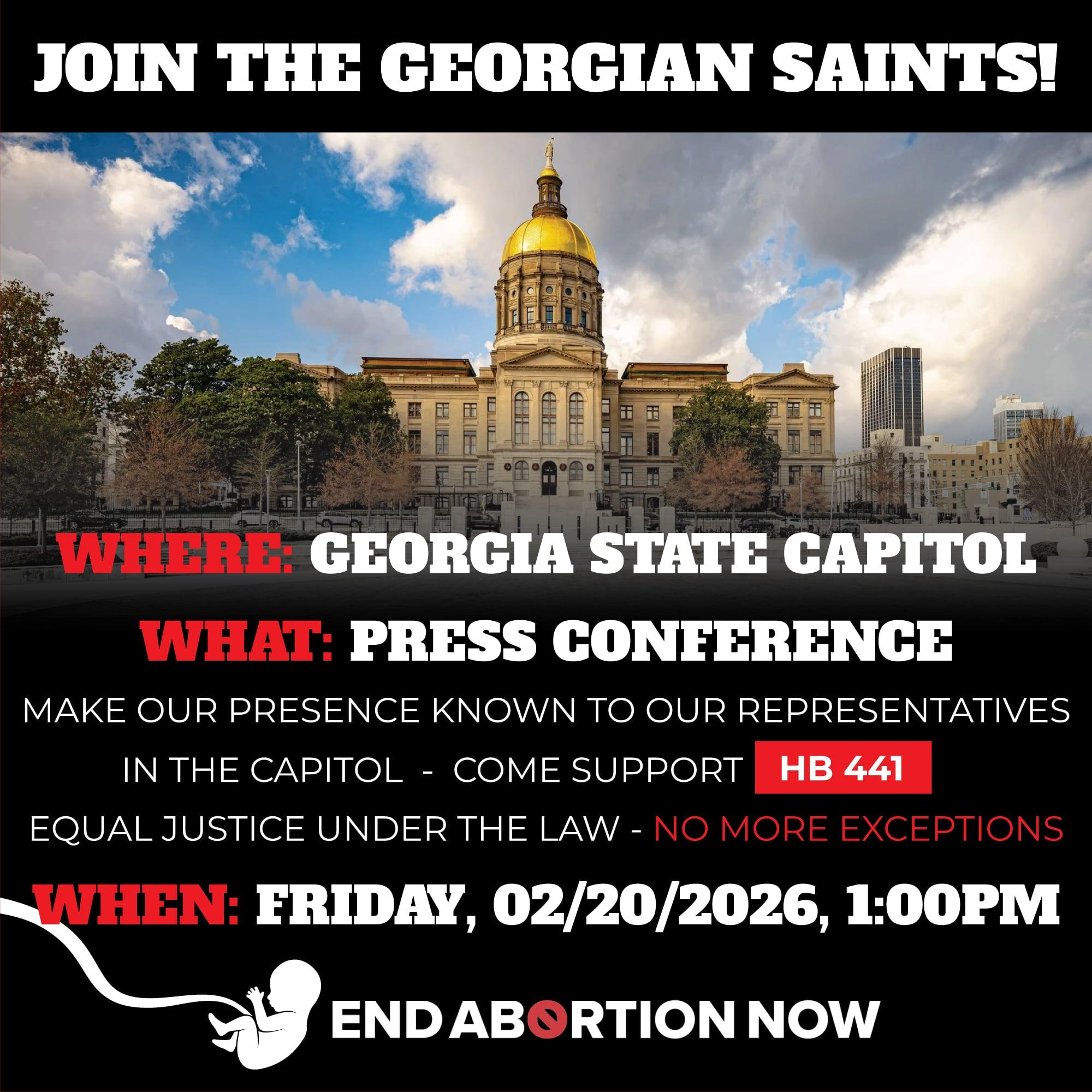 - End Abortion Now will have a Press Conference/Rally in support of HB 441 on Friday, February 20th at 1 p.m. at the State Capitol. Leaders from Georgia and around the nation will address the media and call on Speaker Burns to give the bill a hearing. For the flyer click here.